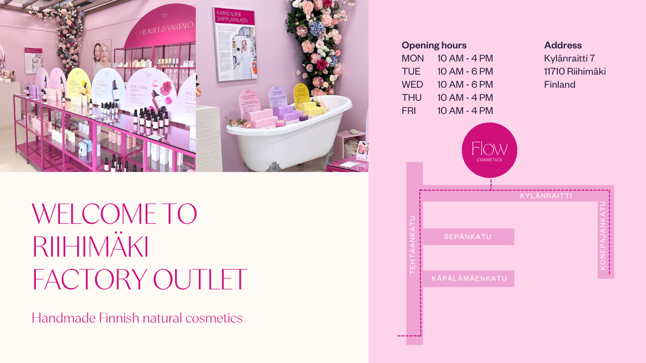 Flow Cosmetics is a natural cosmetics line, based in Riihimäki, Finland, with a selection of soaps, skin and hair care products, and organic essential oils. In addition, we have a outlet shelf, which has a variety of removal items from our products.