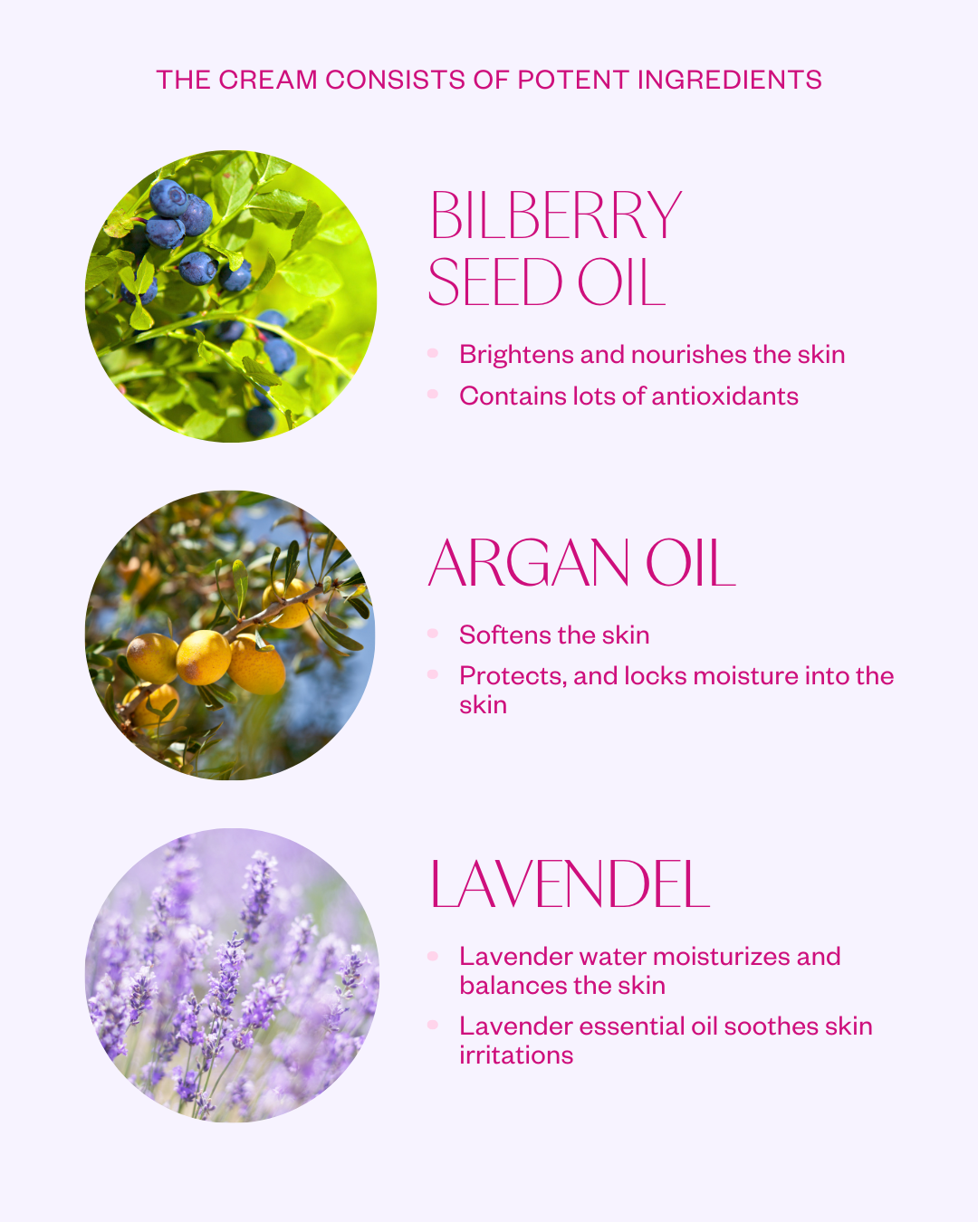 SPECIAL OUTLET BATCH! Bilberry Moisture Cream is a lightweight and velvety absorbing face cream. It provides a pleasant skin feel, making it excellent for use under makeup, also suitable for oily skin.
