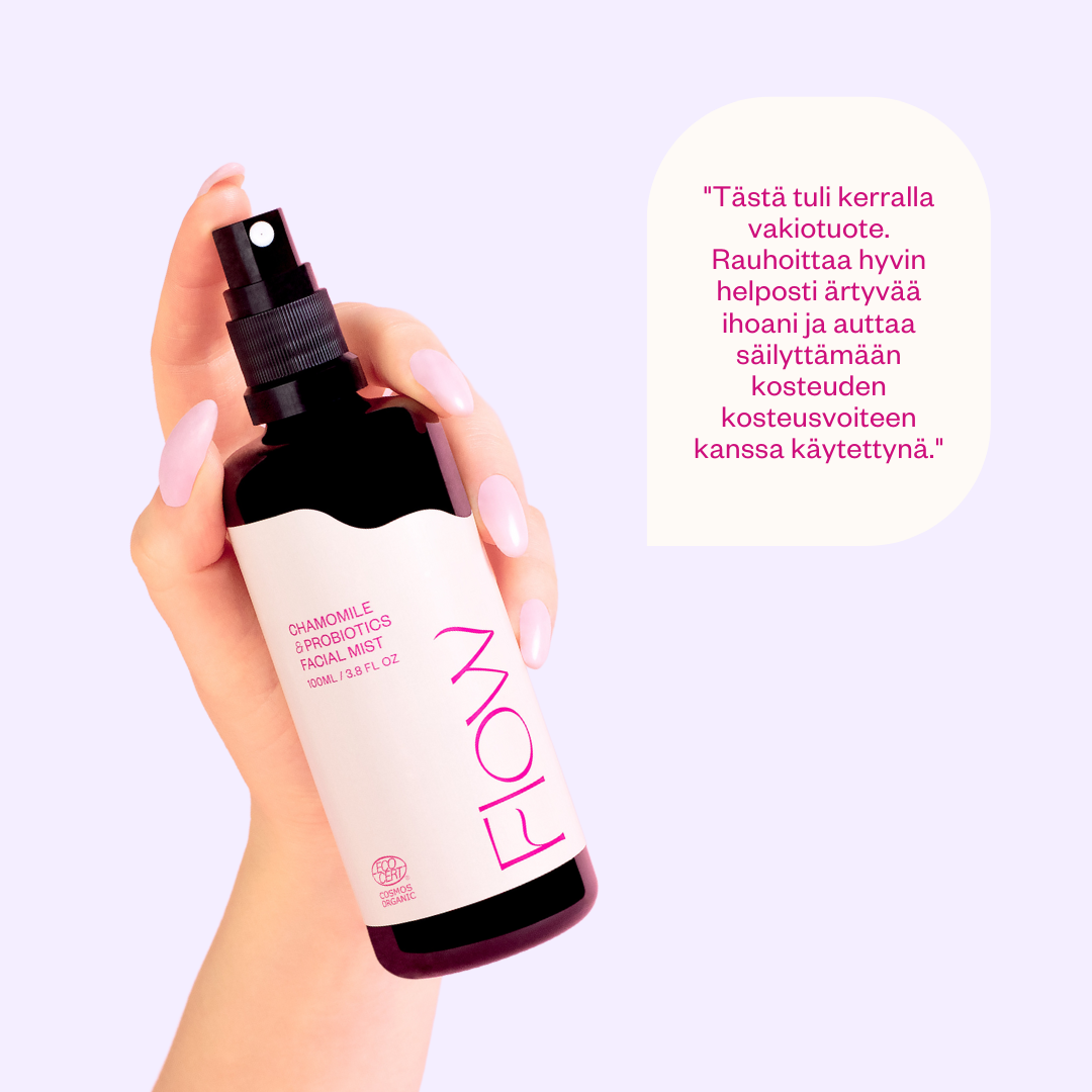 This probiotic chamomile water deeply hydrates and soothes the skin, scalp, and entire body. It combines a premium-quality, anti-aging natural probiotic with organic chamomile water, known for its antimicrobial and calming properties that help reduce redness and inflammation. This gentle treatment mist is specially designed for sensitive, atopic, irritated, red, and dry skin, but it is suitable for all skin types including perioral dermatitis (POD).