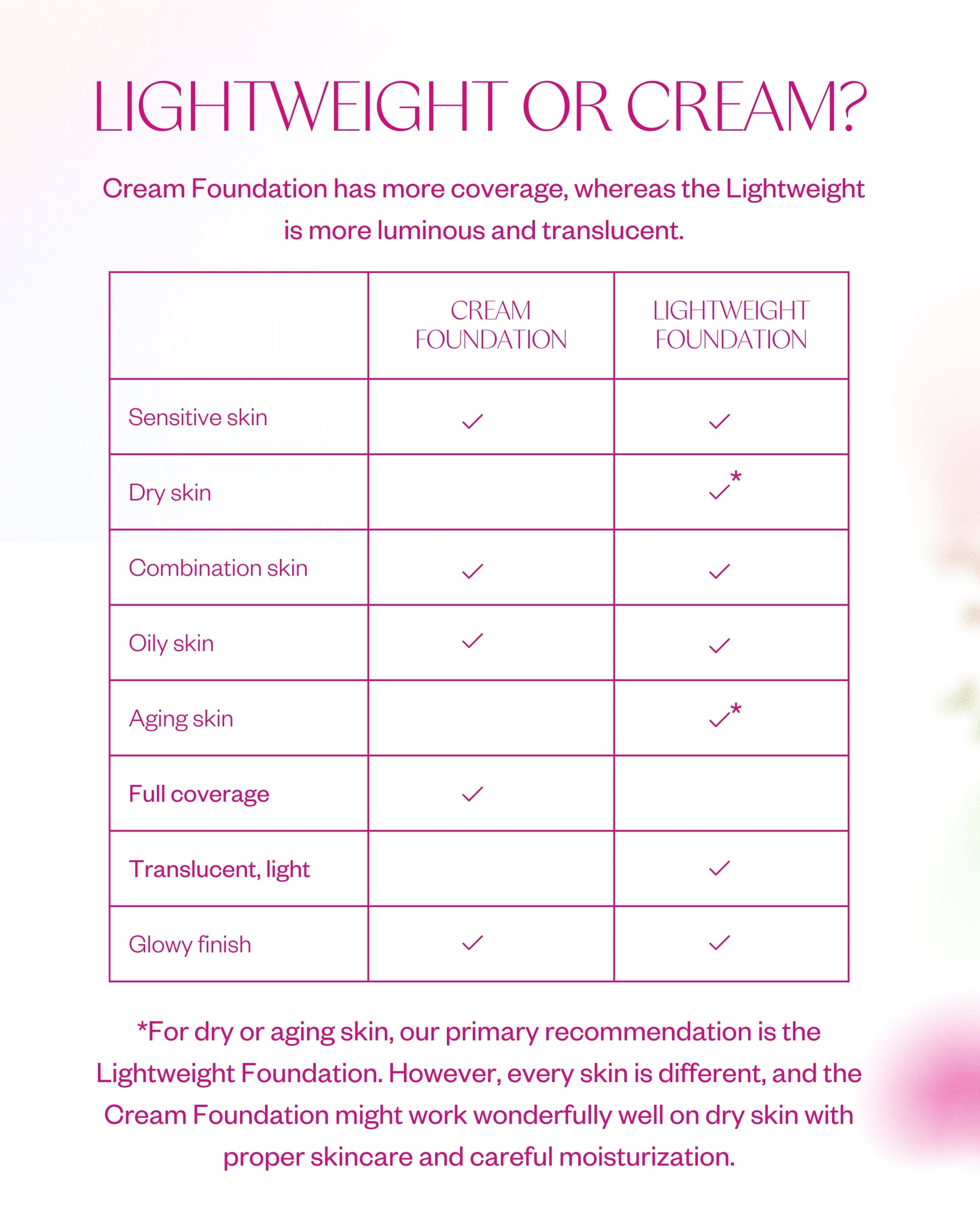 Moisturizing foundation with a natural and radiant finish. The nourishing, lightly smoothing formula contains hyaluronic acid and rose water. Excellent for aging skin. Apply with a brush or fingers and set with finishing powder if necessary.