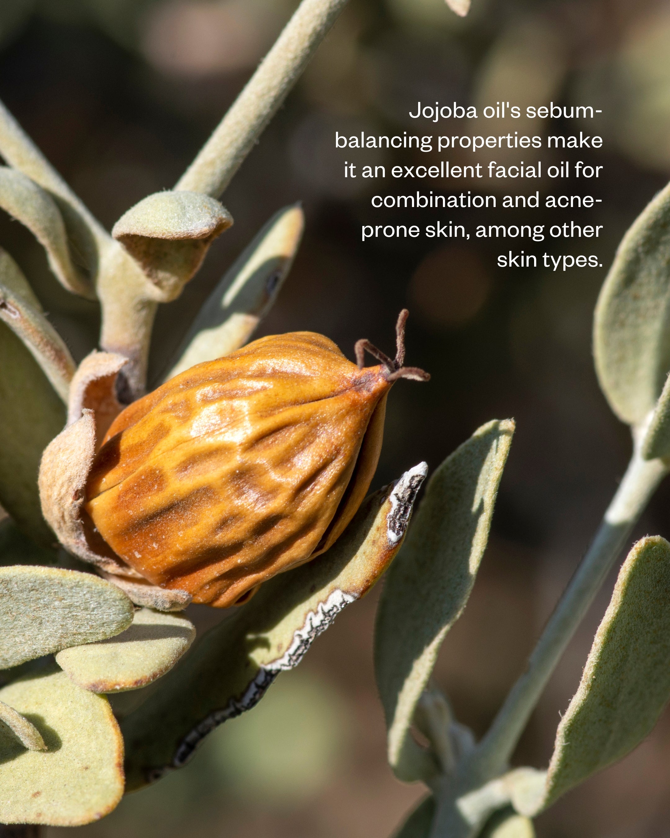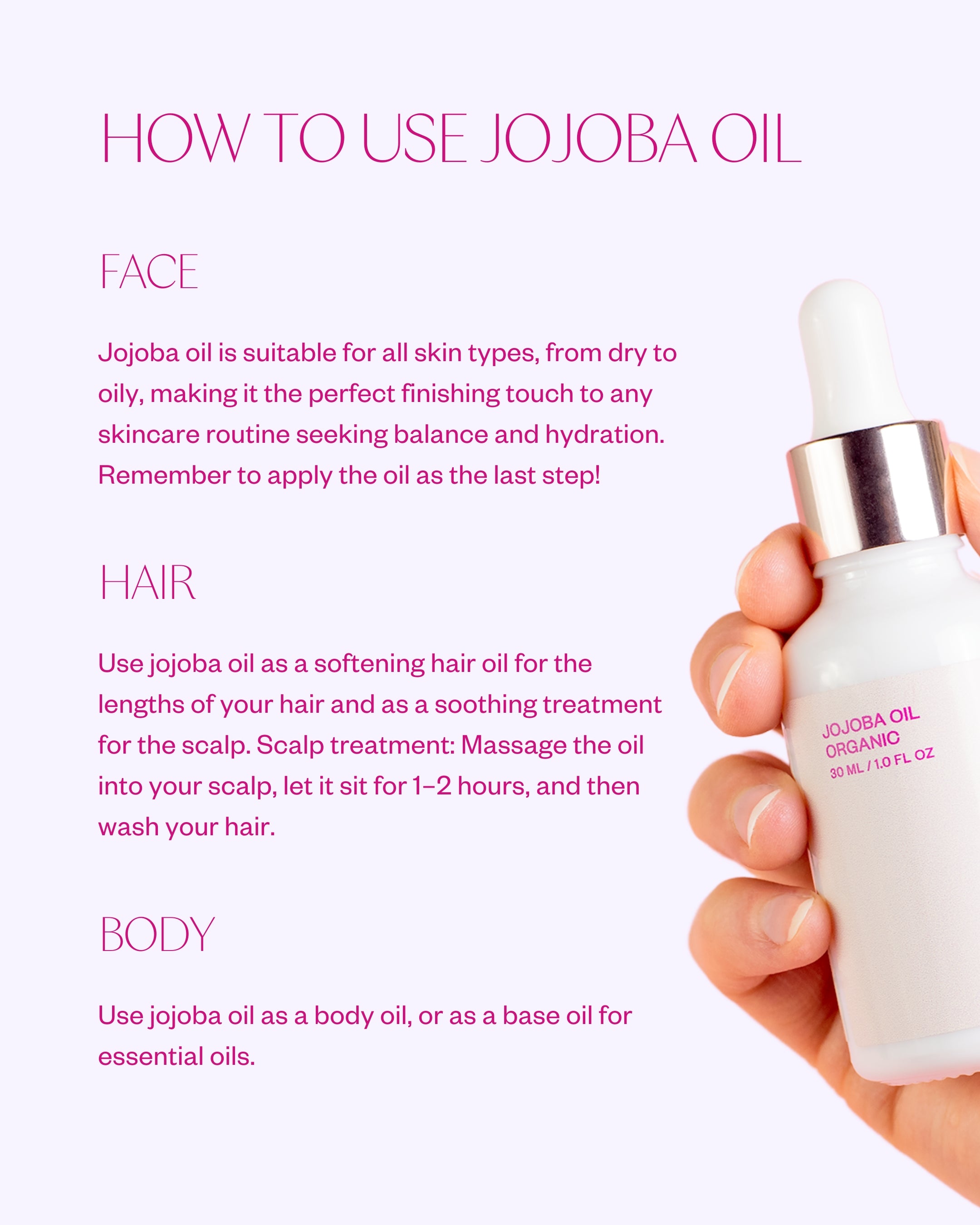 Jojoba oil - A lightweight and multipurpose oil for skin and hair care, also great as a massage oil. Suitable for all skin types. Its composition is similar to the skin’s natural sebum, making it an excellent choice for combination and acne-prone skin. The sebum-balancing properties prevent clogged pores while providing hydration.