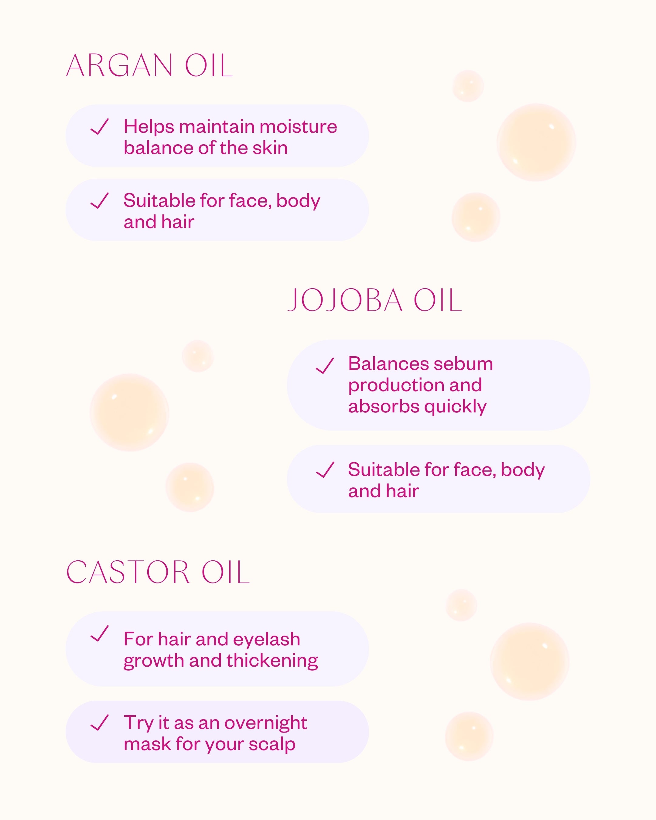 Argan oil - A luxurious and versatile oil for face, body, and hair. Its lightweight texture absorbs well into the skin without leaving a greasy feel.