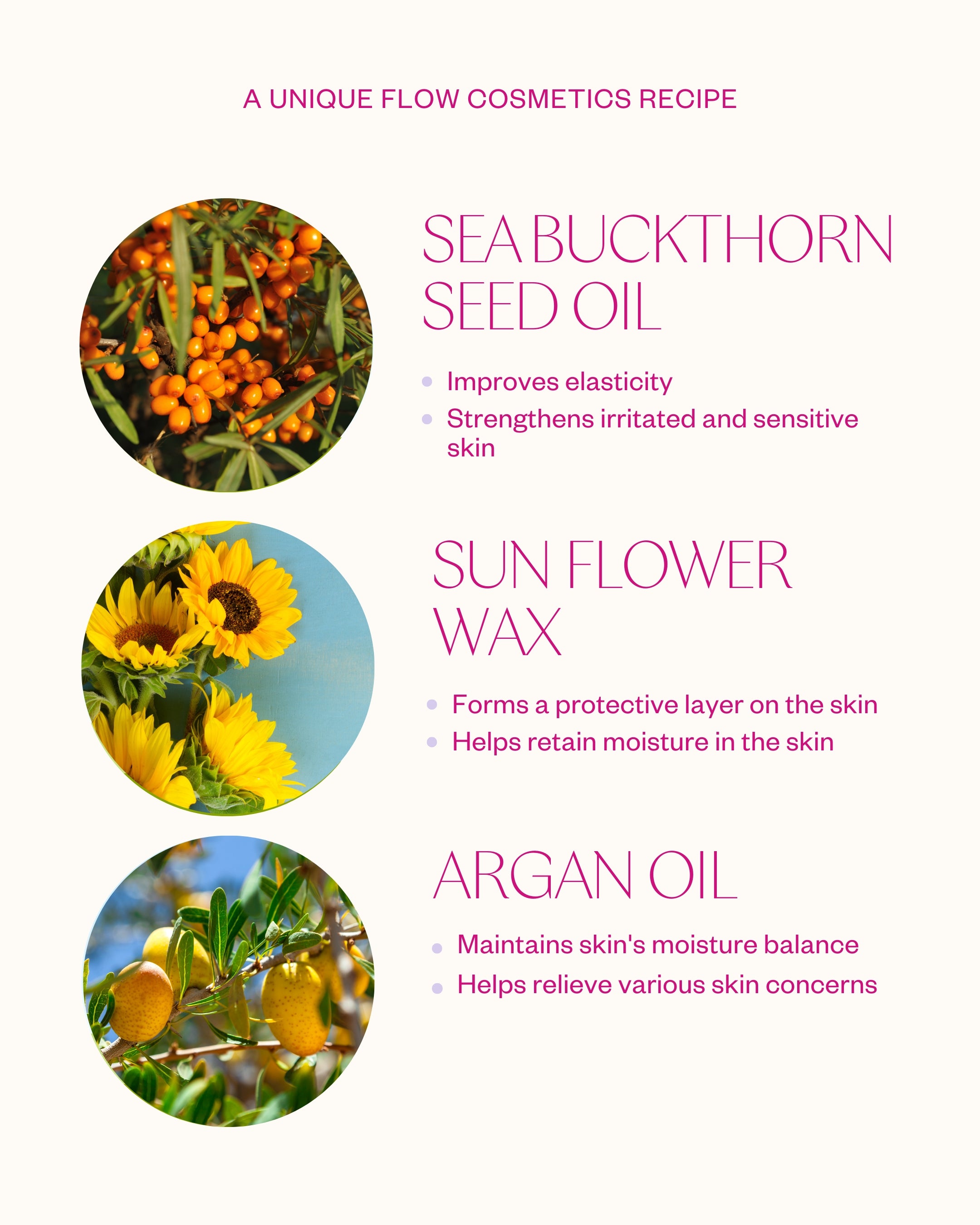 FLOW EXCLUSIVE, ONLY FROM FLOW ONLINE STORE AND FACTORY STORE! The Repair Balm containing sea buckthorn oil and lemon essential oil is suitable for effectively moisturizing dry skin and lips. It is also suitable as a cuticle cream, for chapped skin areas, and as a protective cream.