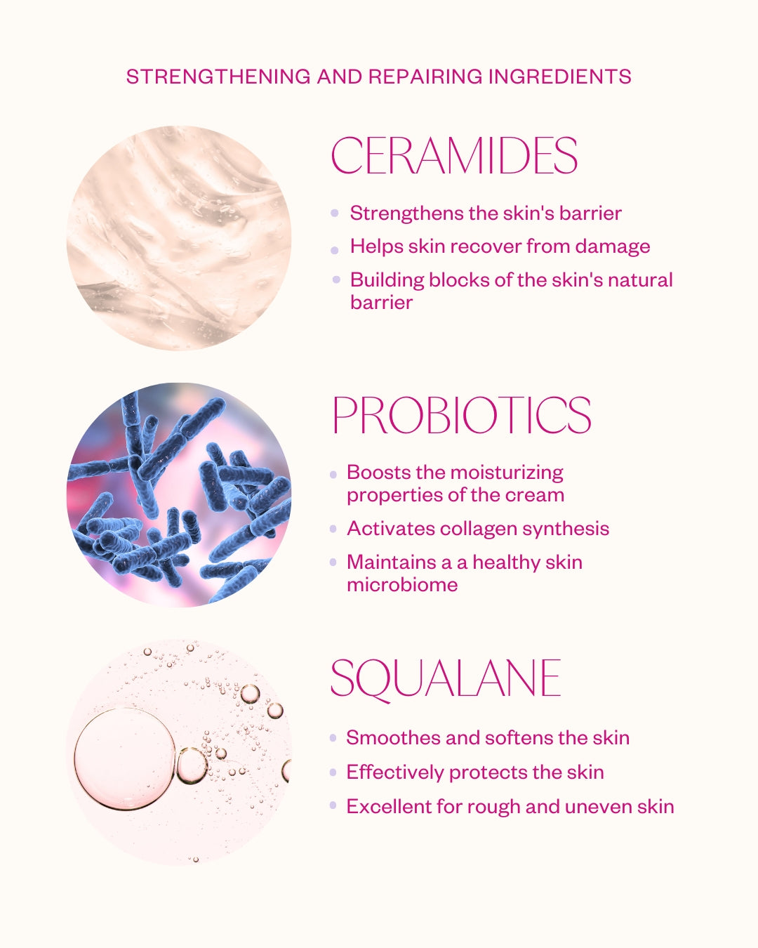 - Probiotics: Help maintain a healthy microbial balance on the skin and support the body in fighting off harmful microbes. Probiotics activate collagen synthesis and enhance the product's moisturizing properties.