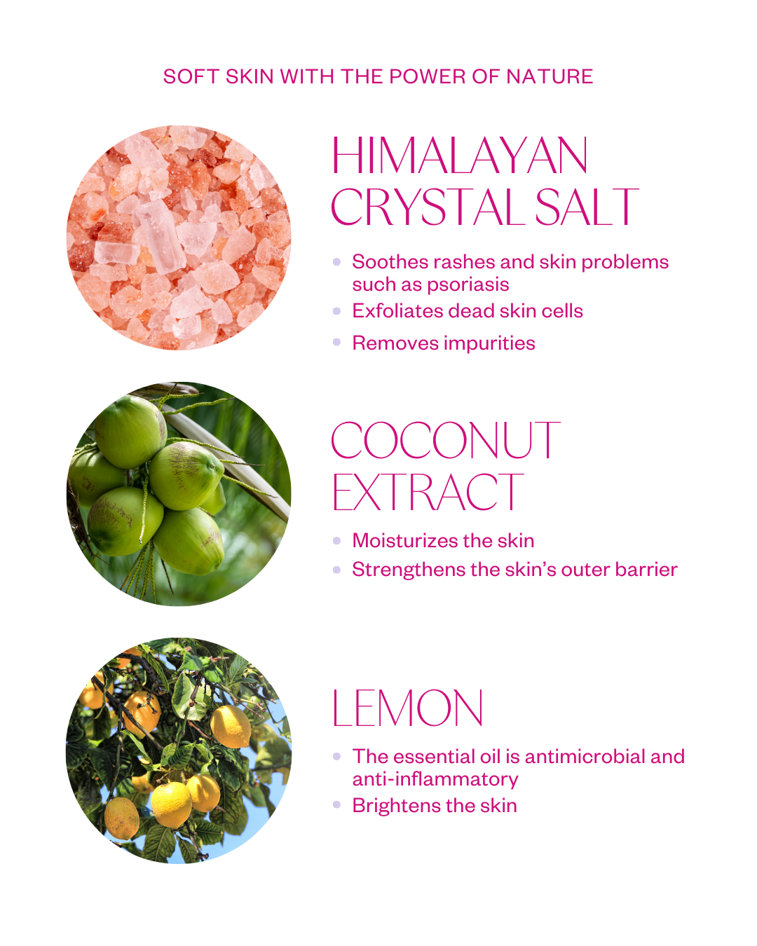 - Himalayan crystal salt: Soothes rashes and skin issues like psoriasis. Exfoliates dead surface cells. Detoxifying; removes impurities from the skin. Brightens the skin. Balances skin pH, moisturizes, and reduces inflammation.