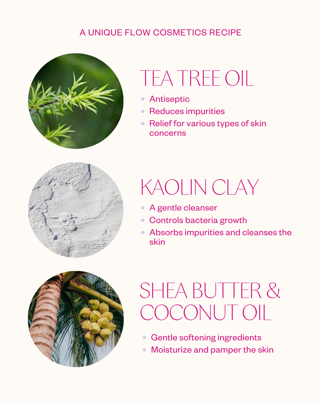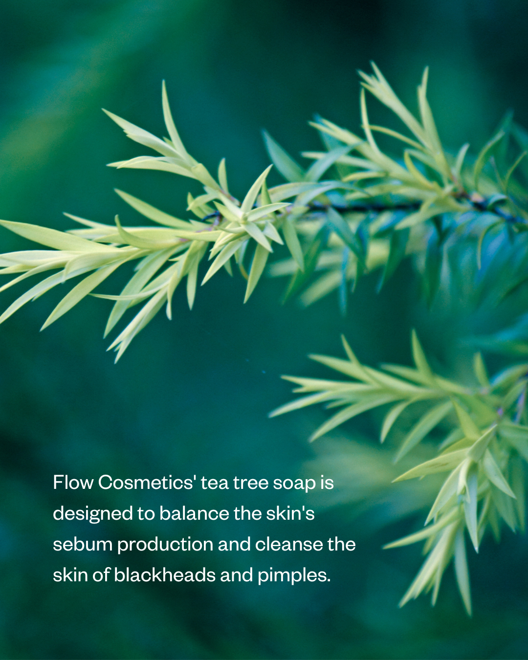 This tea tree oil containing cleanser for oily and blemished skin helps control acne and balance oil production. Suitable for treating various skin problems across the entire body. Flow Cosmetics' bar soaps are handmade in Riihimäki using the finest organic ingredients.